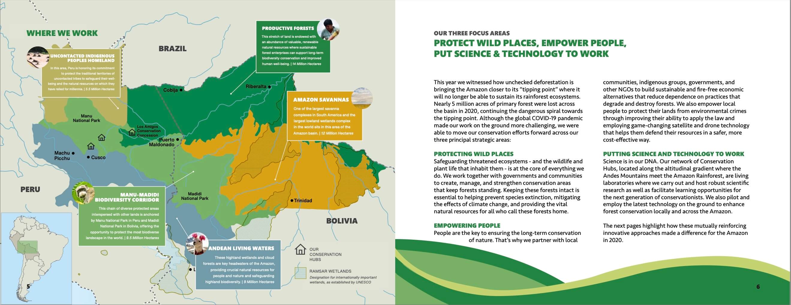 The objective of this project was to create an annual report that highlighted major success stories from each of the organization's three main focus areas, Protecting Wild Places, Empowering People, and Putting Science and Technology to Work.