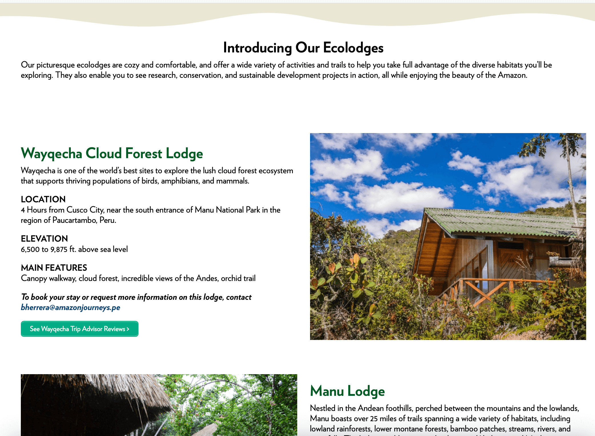 WebsiteThe organization had biological stations that could host tourists interested in birdwatching, called "ecolodges". Below is a page I designed to promote their 3 locations.