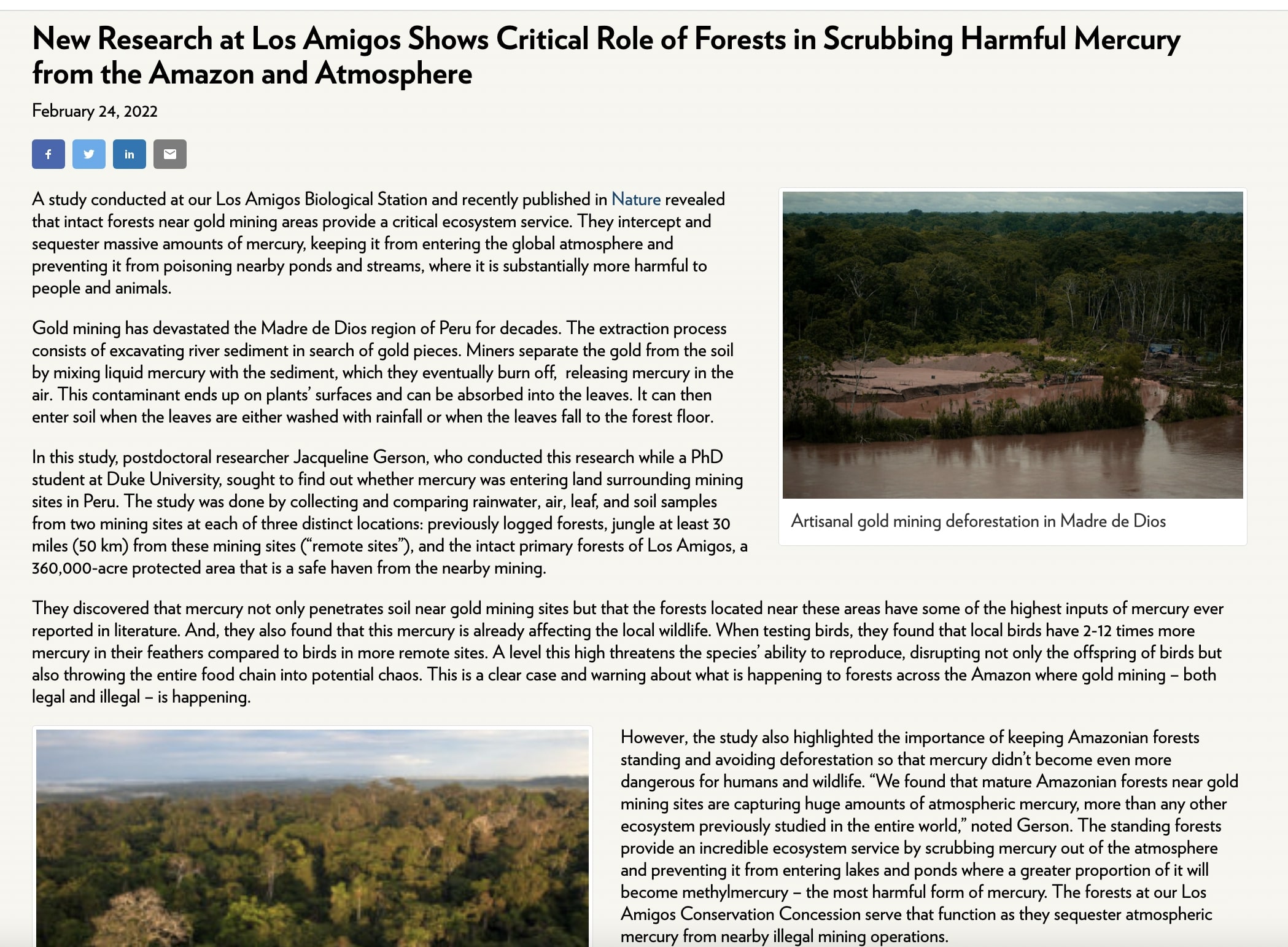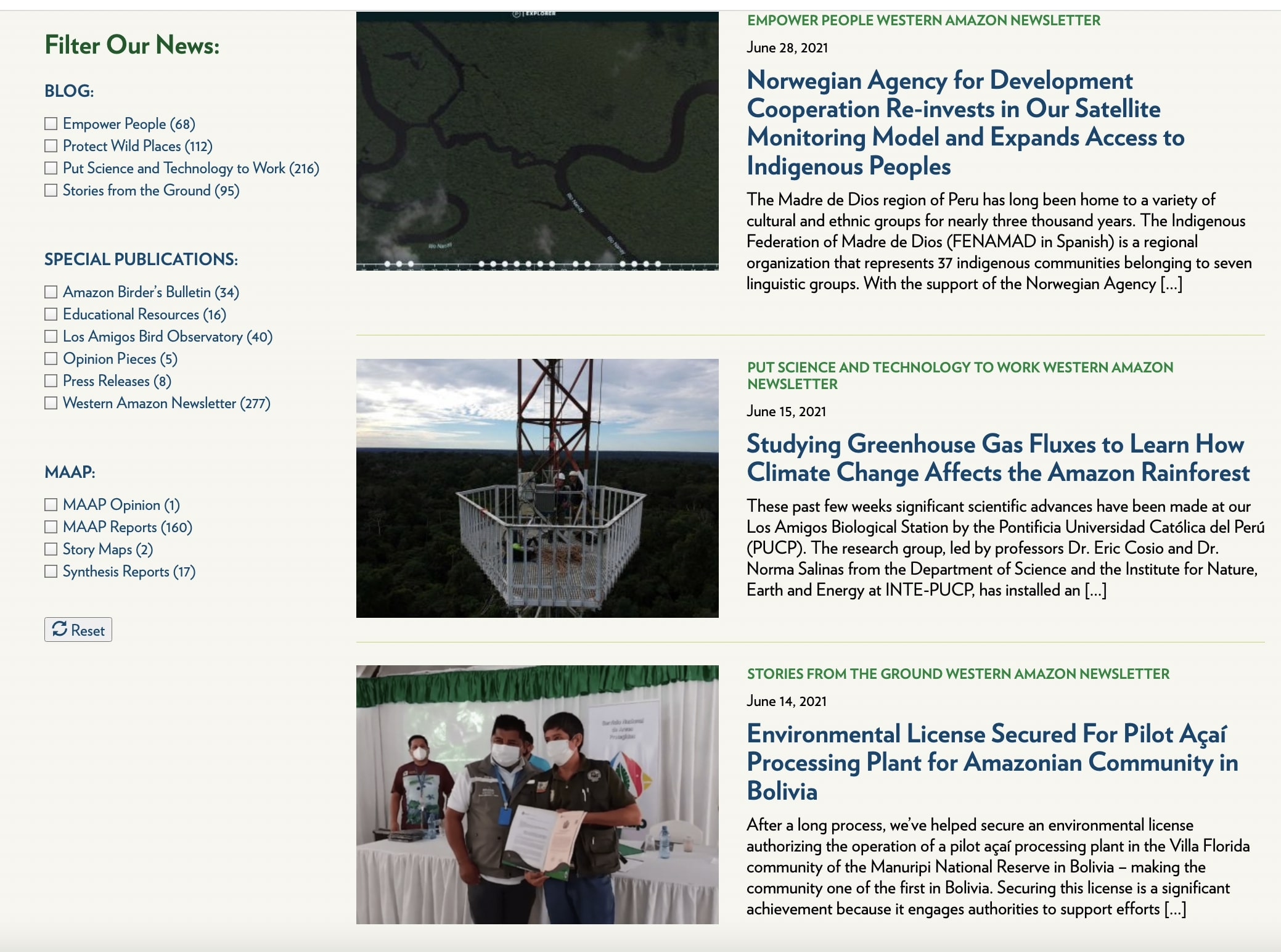 Amazon Conservation Blog page and examples of stories I wrote. All stories in this screenshot are ones that I authored and published to the website.