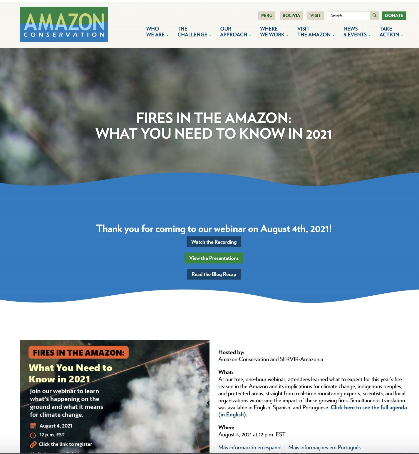 WebsiteBelow is an event page I for the Fires in the Amazon Webinar. I often had to create events pages (and all promotional materials) in English, Spanish, Portuguese)