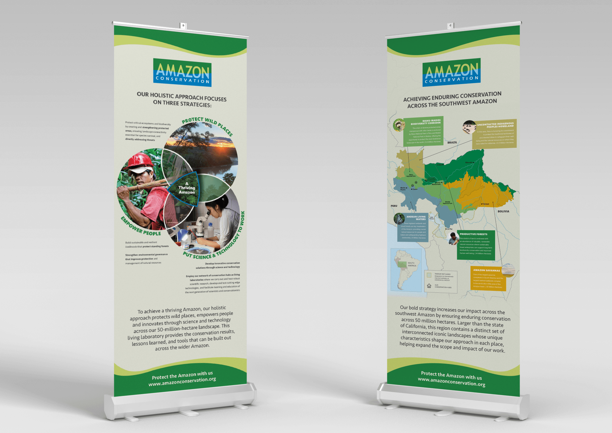 The objective of this project was to create two retractable banners for Amazon Conservation to use as display pieces for their event at the Peruvian embassy in 2022. These banners served as a marketing tool to promote the organization and their main focus areas and region of work. The left banner promotes their methods of conservation and the right on their focus landscapes.