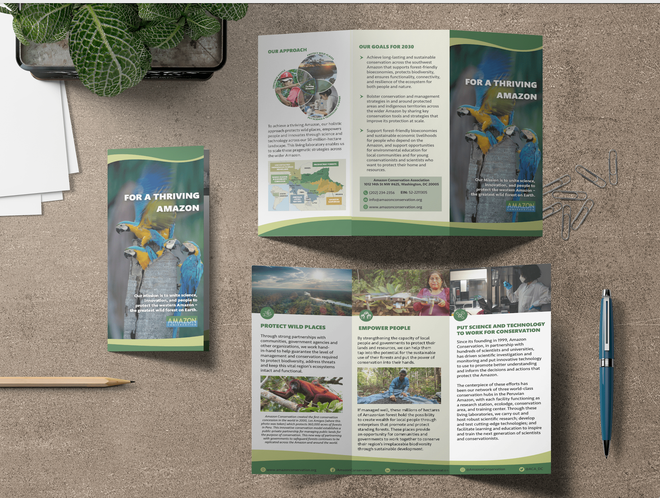 The objective of this project was to create a brochure for Amazon Conservation to use as a marketing tool to promote the organization's 10-year strategy and their main focus areas: Protecting Wild Places, Empowering People, and Putting Science and Technology to Work for Conservation.
