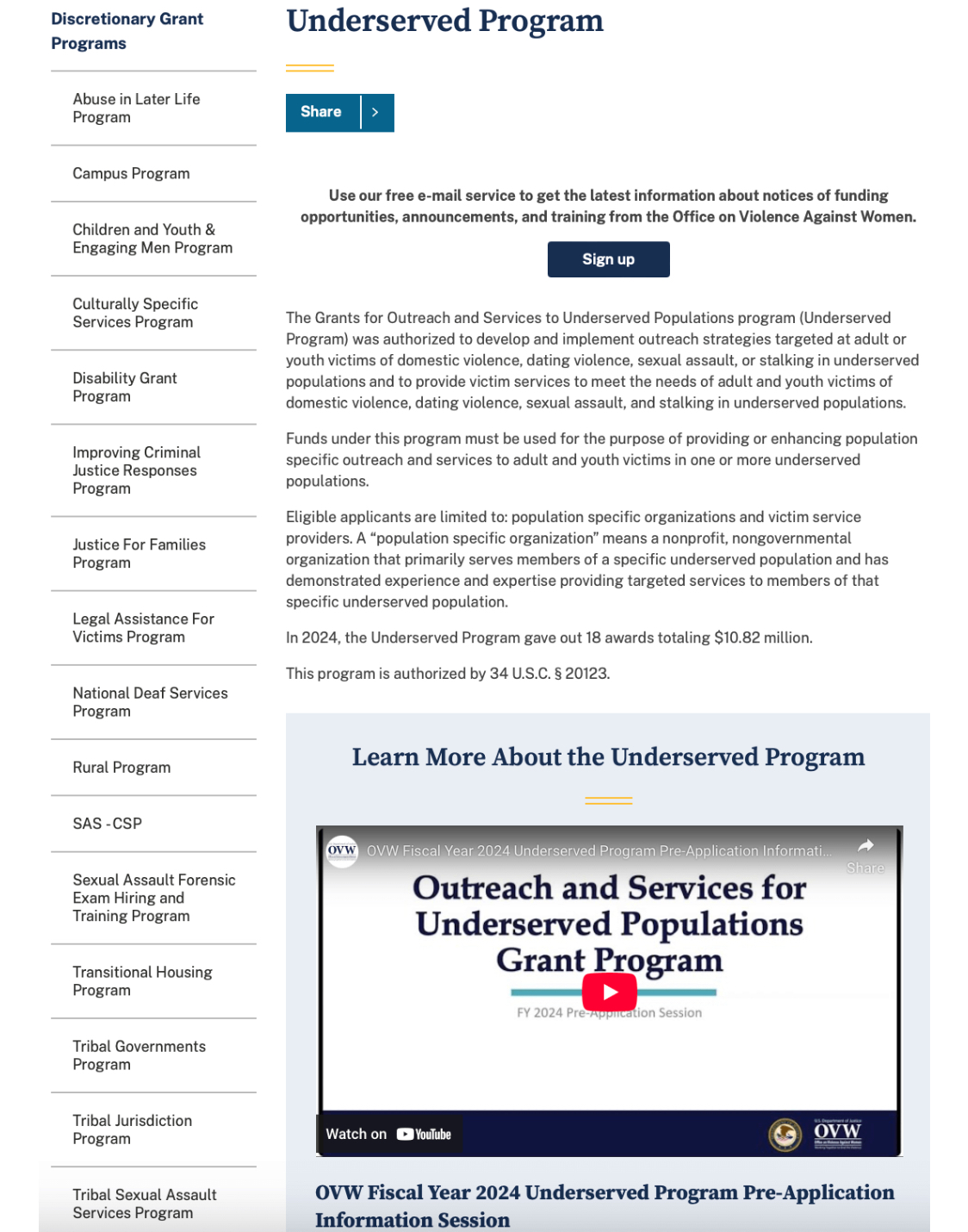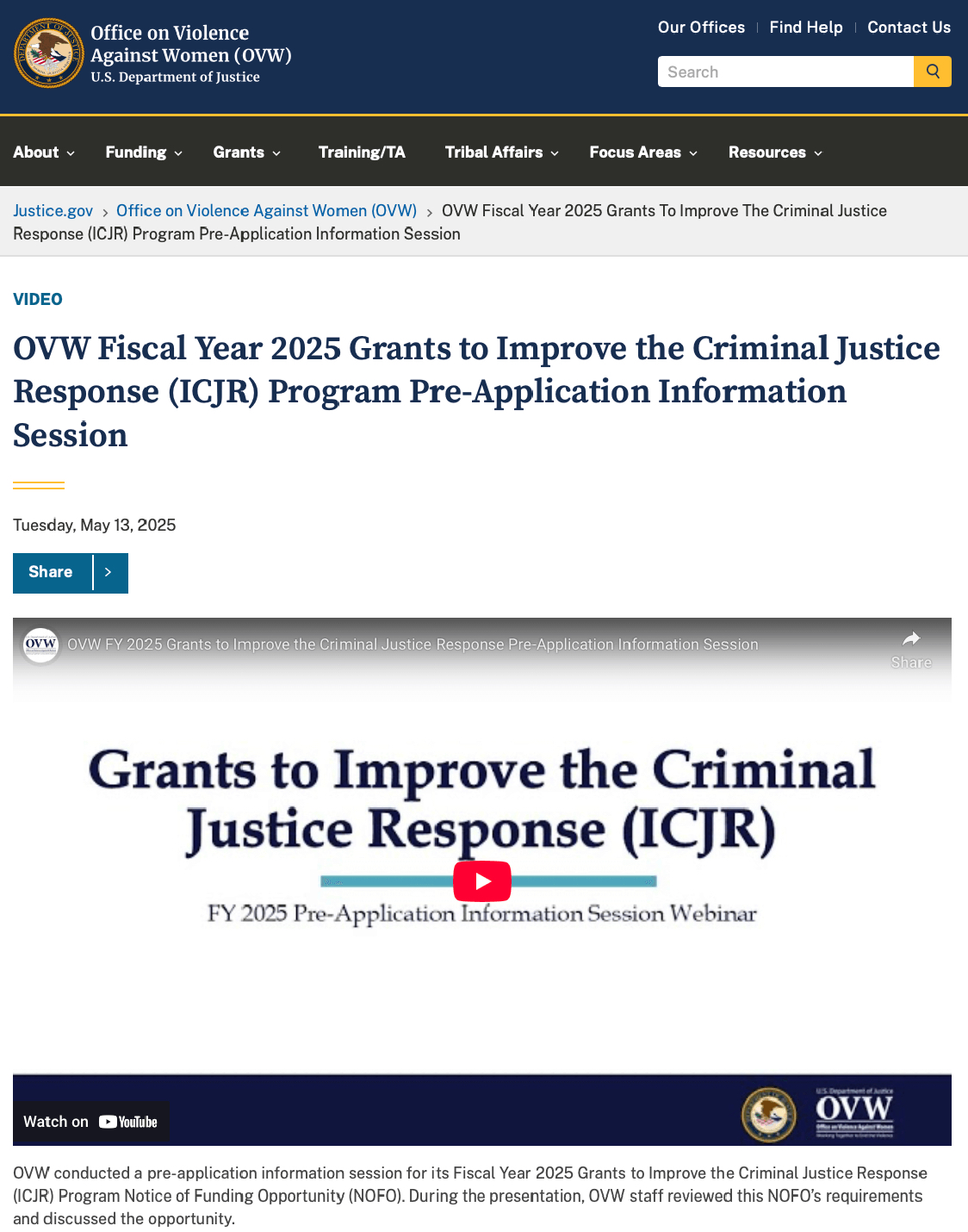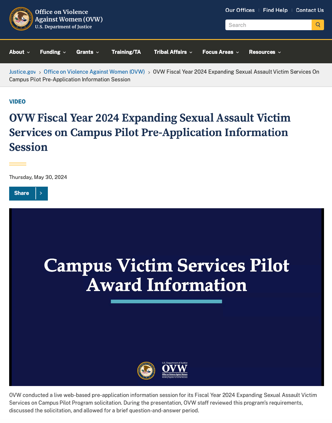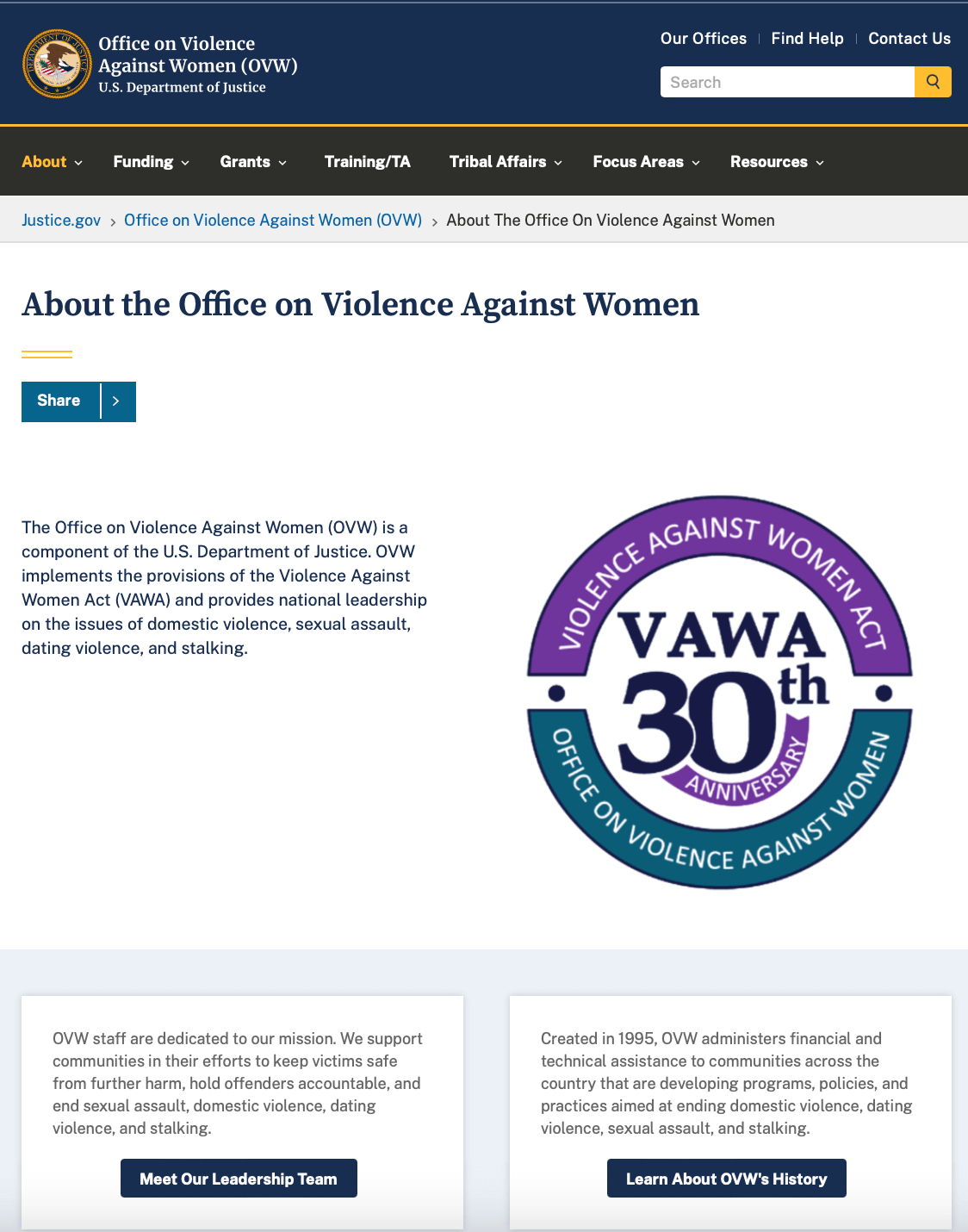 Redesign and remediation of component website for U.S. Department of Justice: Office on Violence Against Women, improving design and usability as they migrated from Drupal 7 to 9.