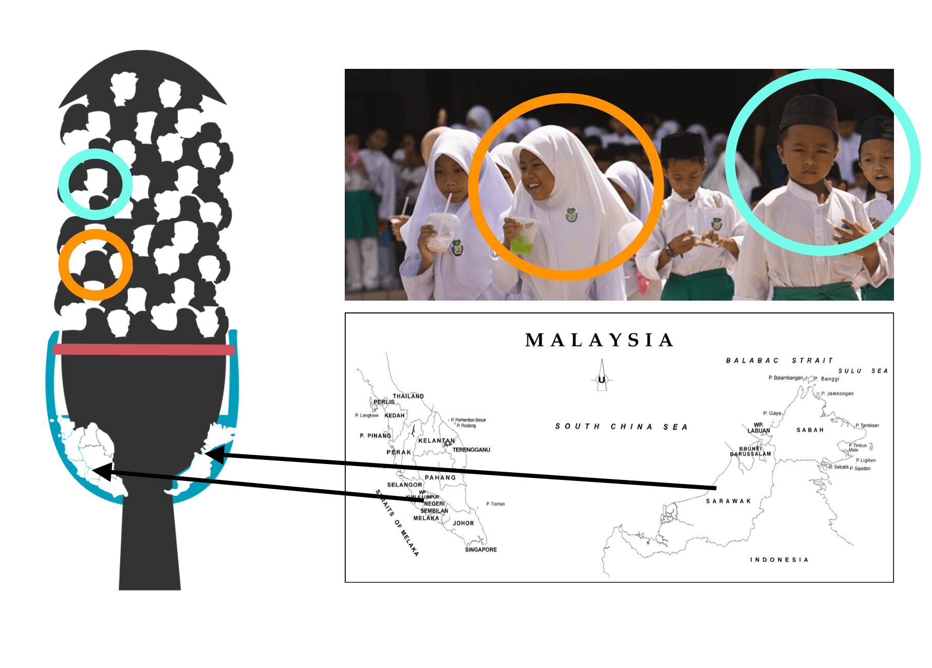 I came to the conclusion that I could represent the idea of 'one and many', by adding different student faces into the part of the microphone a person speaks into. In the microphone there are silhouettes of different male and female students. Some have long hair; some have short hair. Some male students are wearing the traditional flat-topped ‘songkok’ hat and some of the female students are wearing hijab.