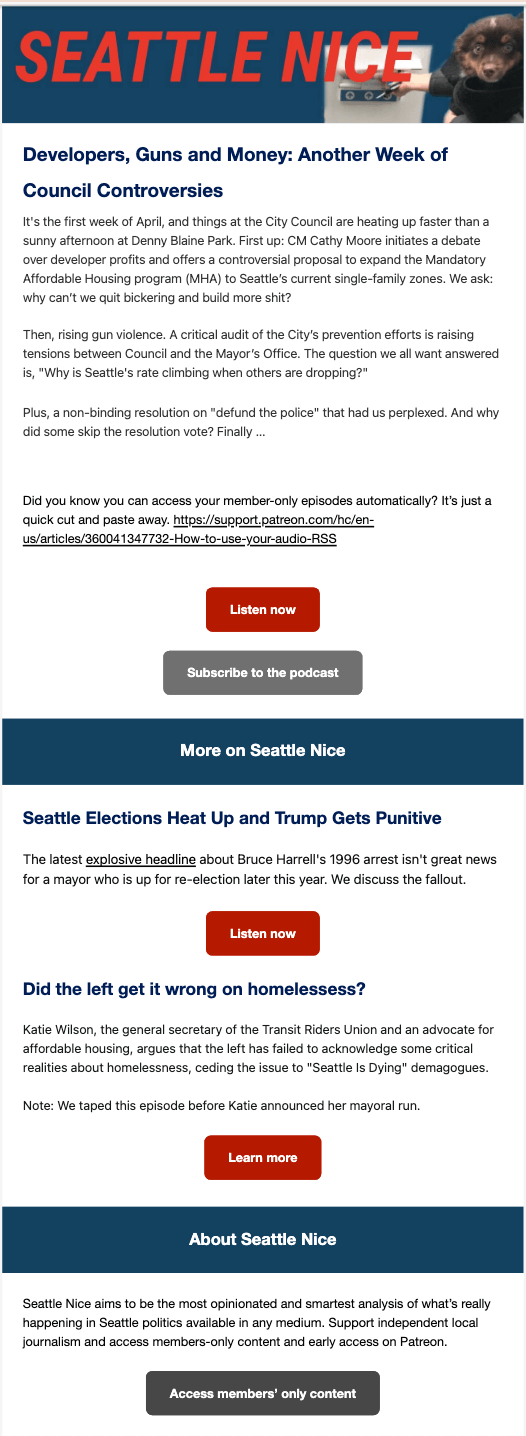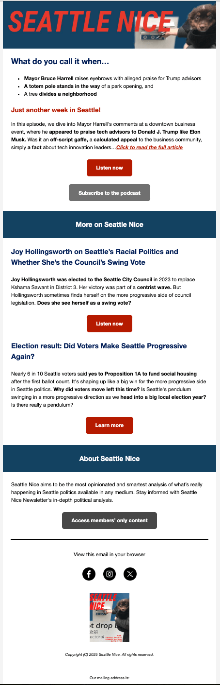 This newsletter is now a key part of their communications strategy, and is used whenever there is a new podcast episode to promote. I also created a responsive, on-brand site for Seattle Nice that supports the podcast's growth and community-building goals